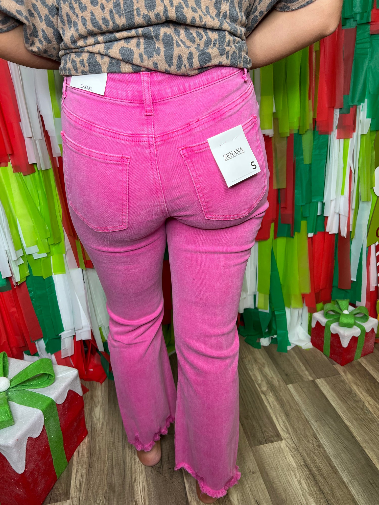 Acid Washed High Waist Distressed Straight Leg Pants - Hot Pink