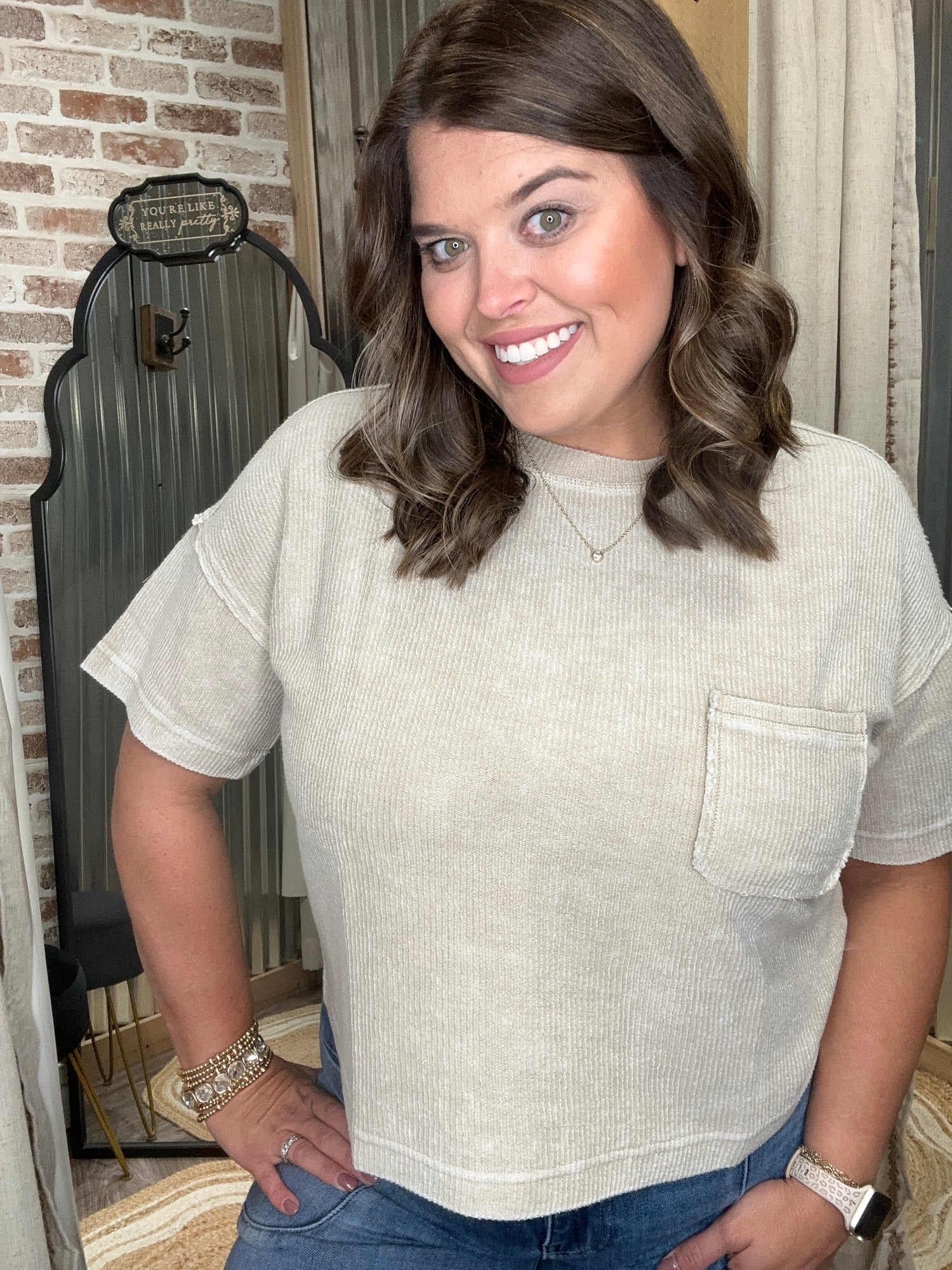 Khaki washed ribbed short sleeve tee with pocket. 60% cotton, 40% polyester