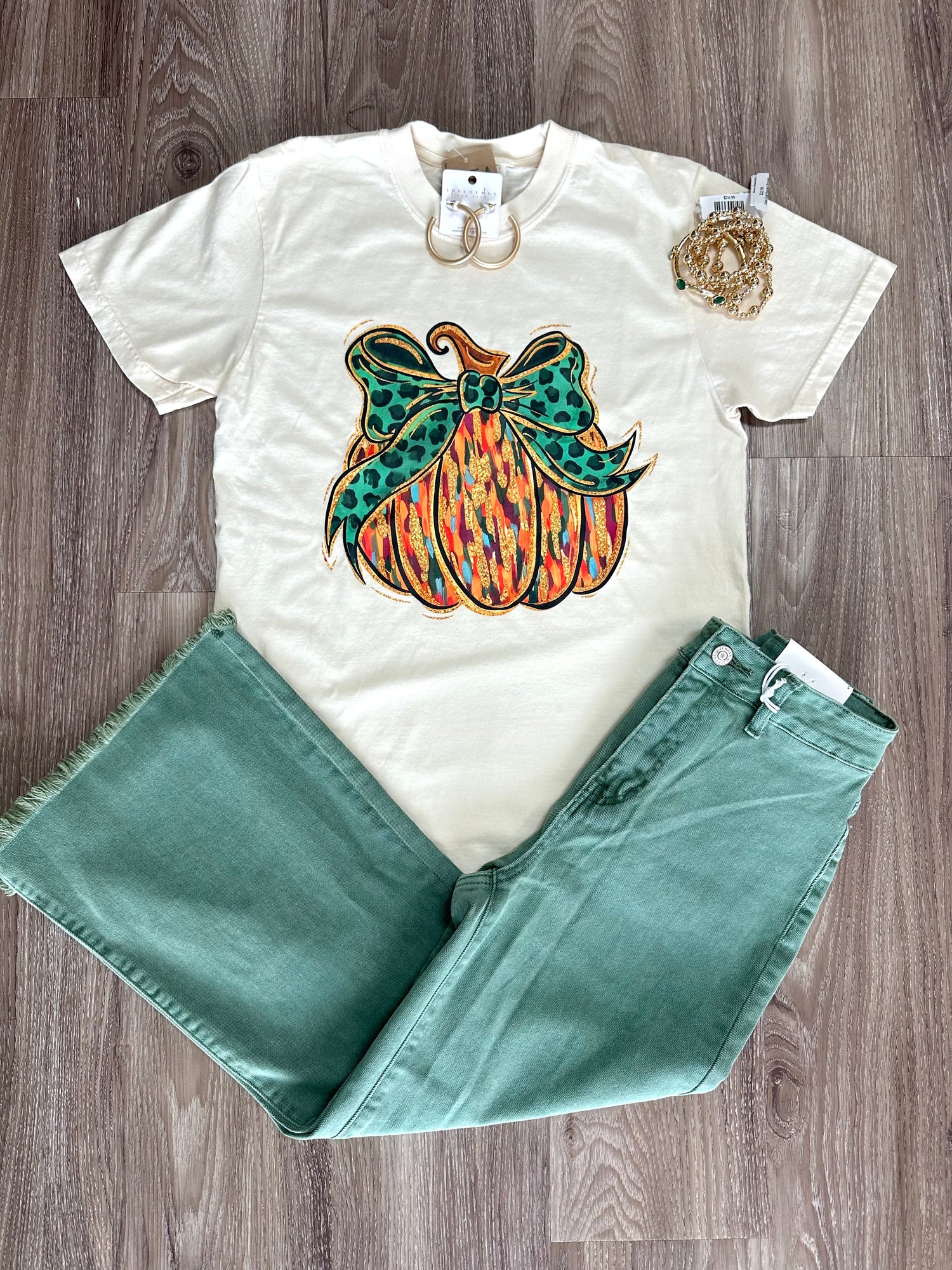 This isn’t your average pumpkin—it’s a bold, glam statement piece. A rich mix of fall brushstrokes in gold, orange, and teal creates the perfect backdrop, while a green leopard bow ties it all together with an unexpected edge. The combination of cozy autumn textures with a dash of wild flair. It’s the kind of pumpkin that doesn’t just sit on the porch—it struts right into spooky season with style.