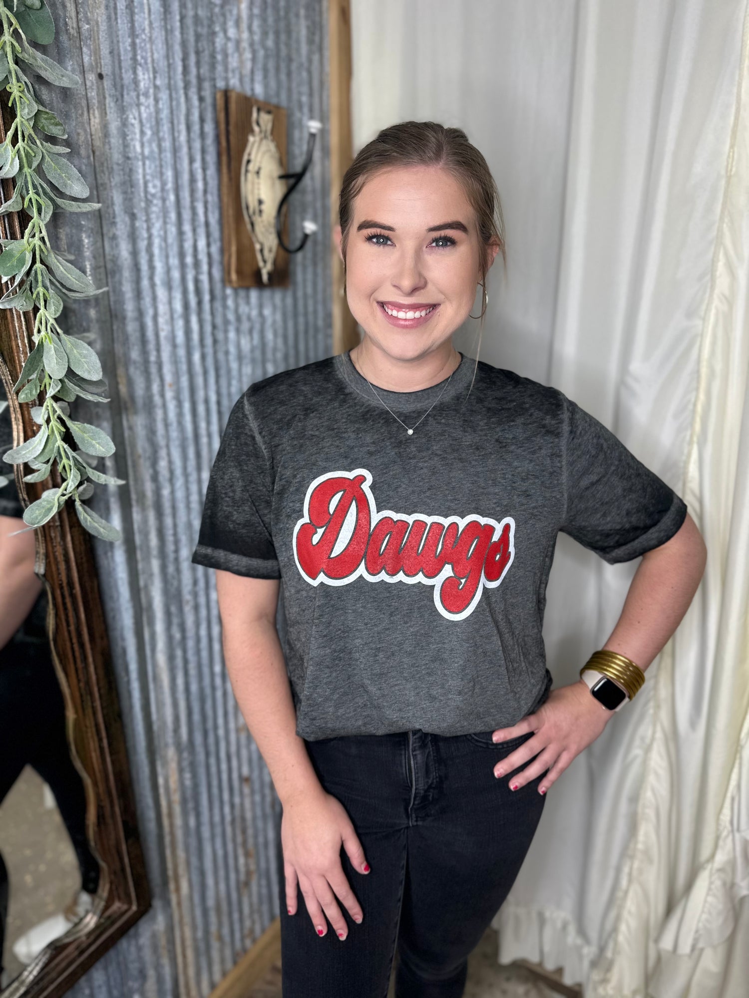 Black acid wash Dawgs Tee printed in red with a white outline. Some T-shirts are more see through than others.