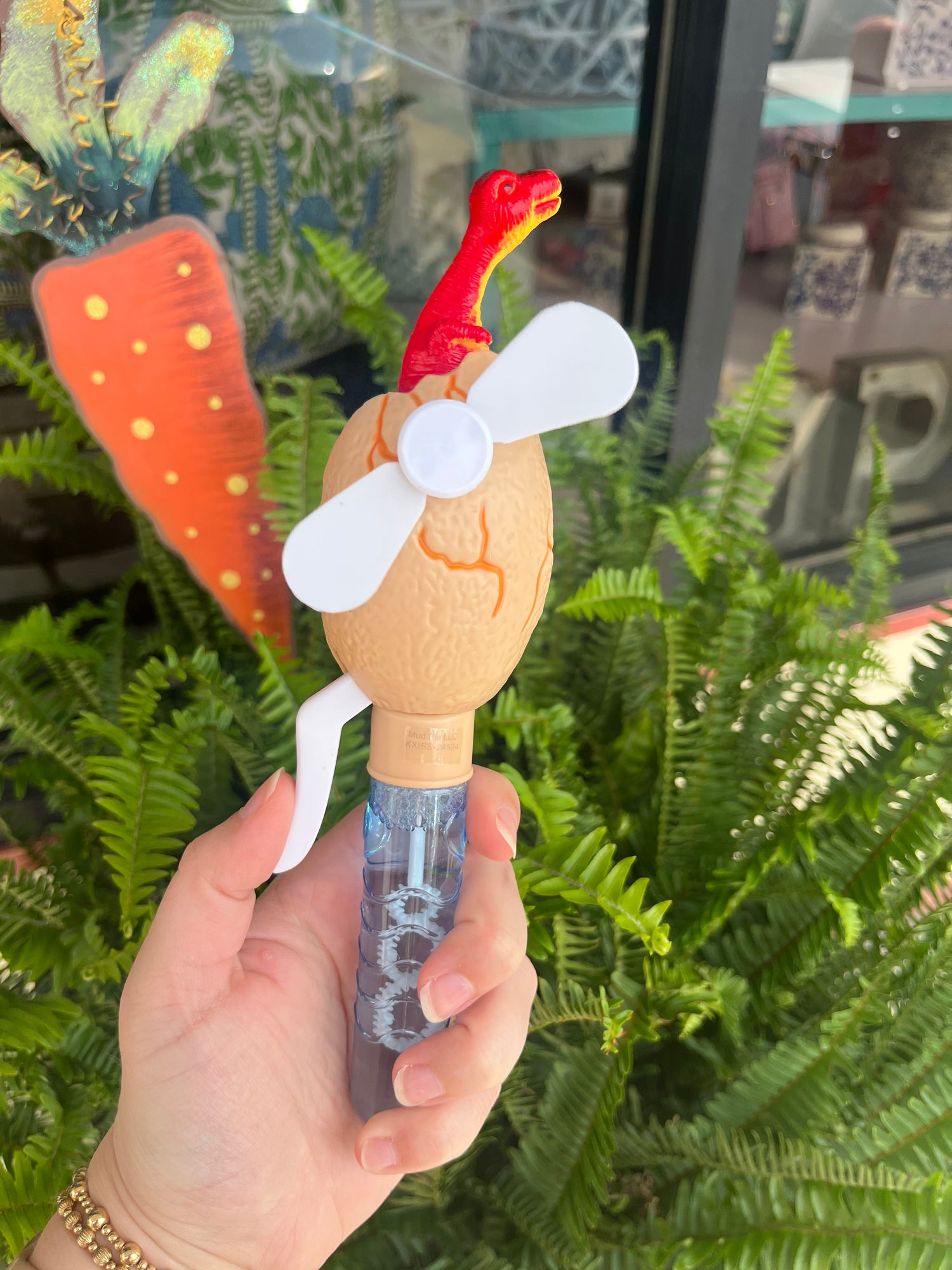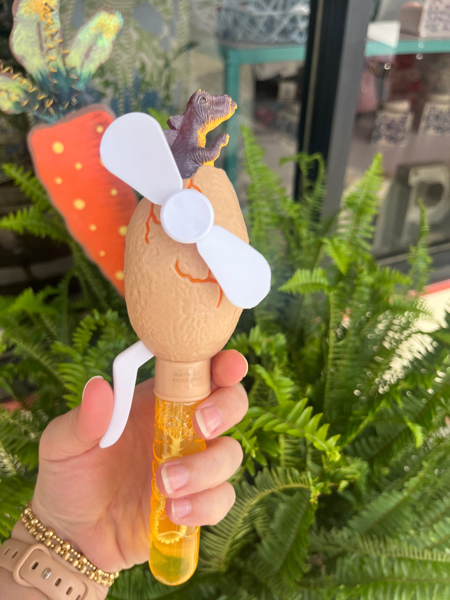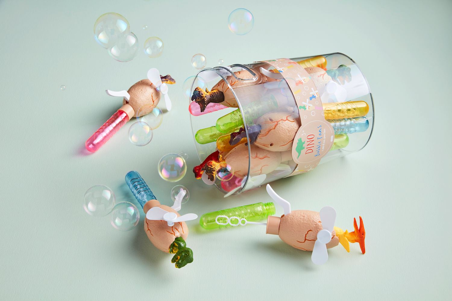 Dinosaur bubble fan. Bubble solution included. Comes in acrylic display bucket. Ages 3+.