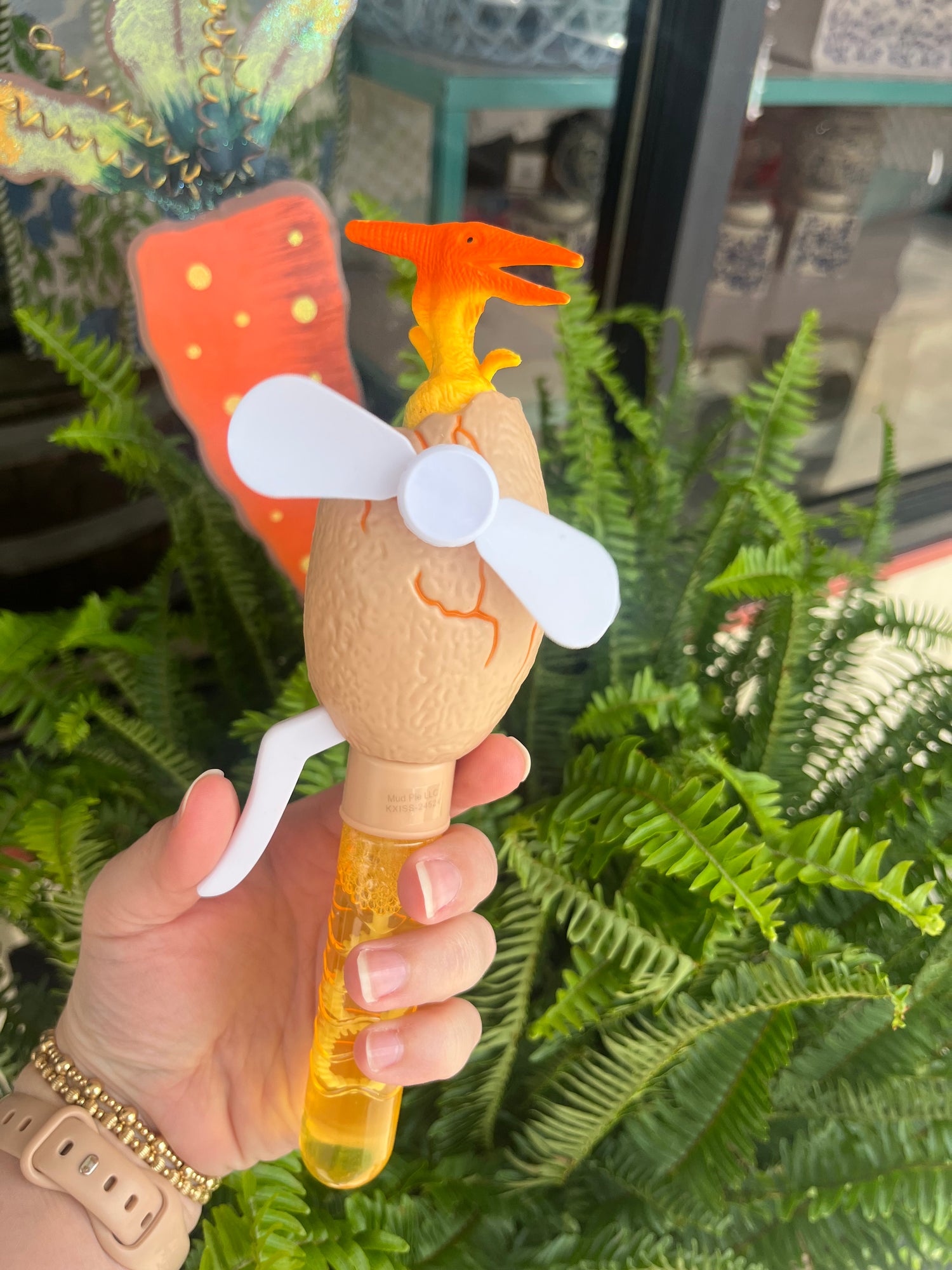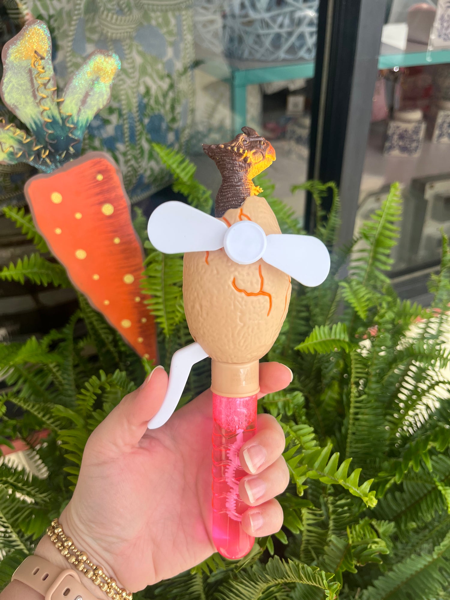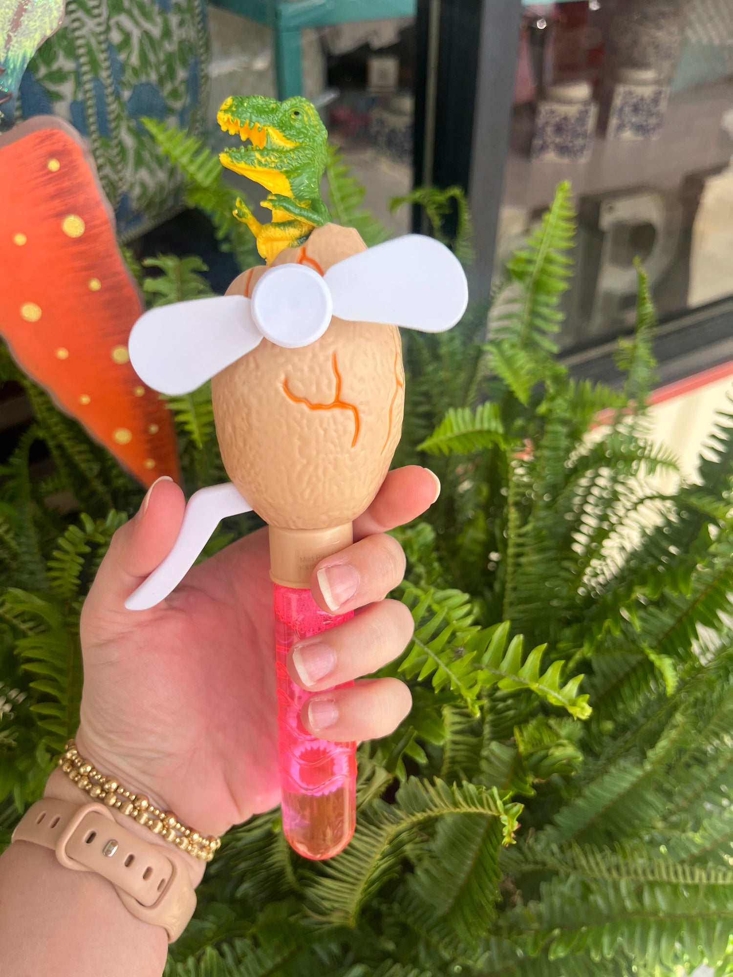 Dinosaur bubble fan. Bubble solution included. Comes in acrylic display bucket. Ages 3+.