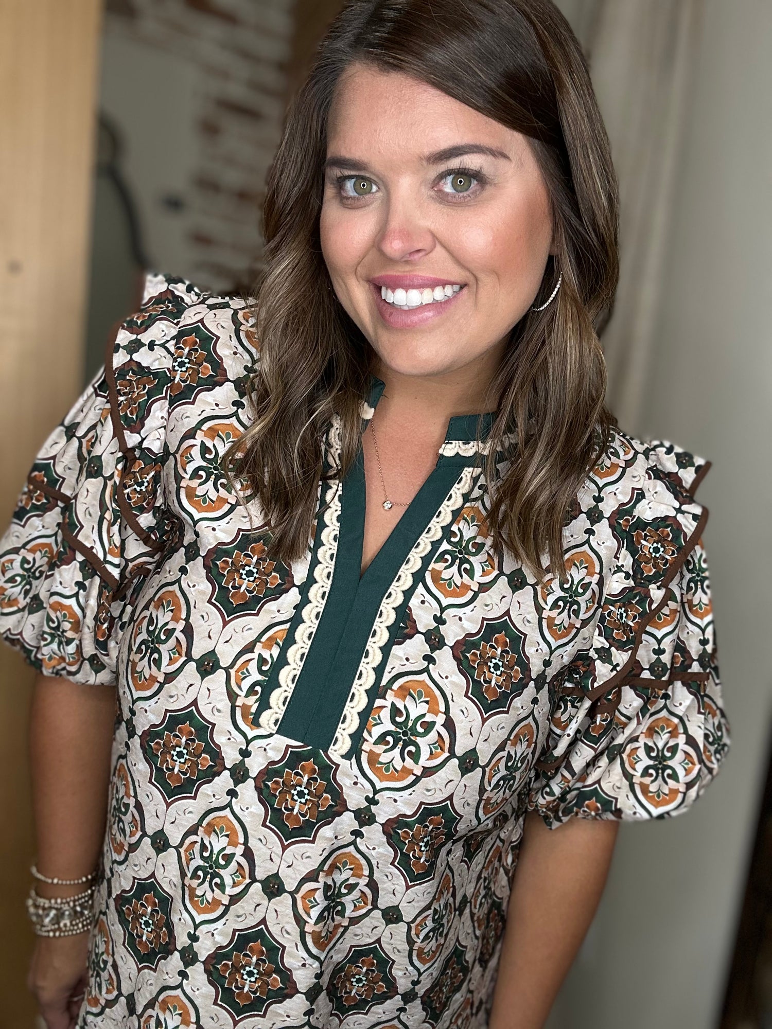 PUFF SLEEVE RUFFLE SHOULDER CONTRAST V NECK WITH LACE WOVEN PRINT TOP