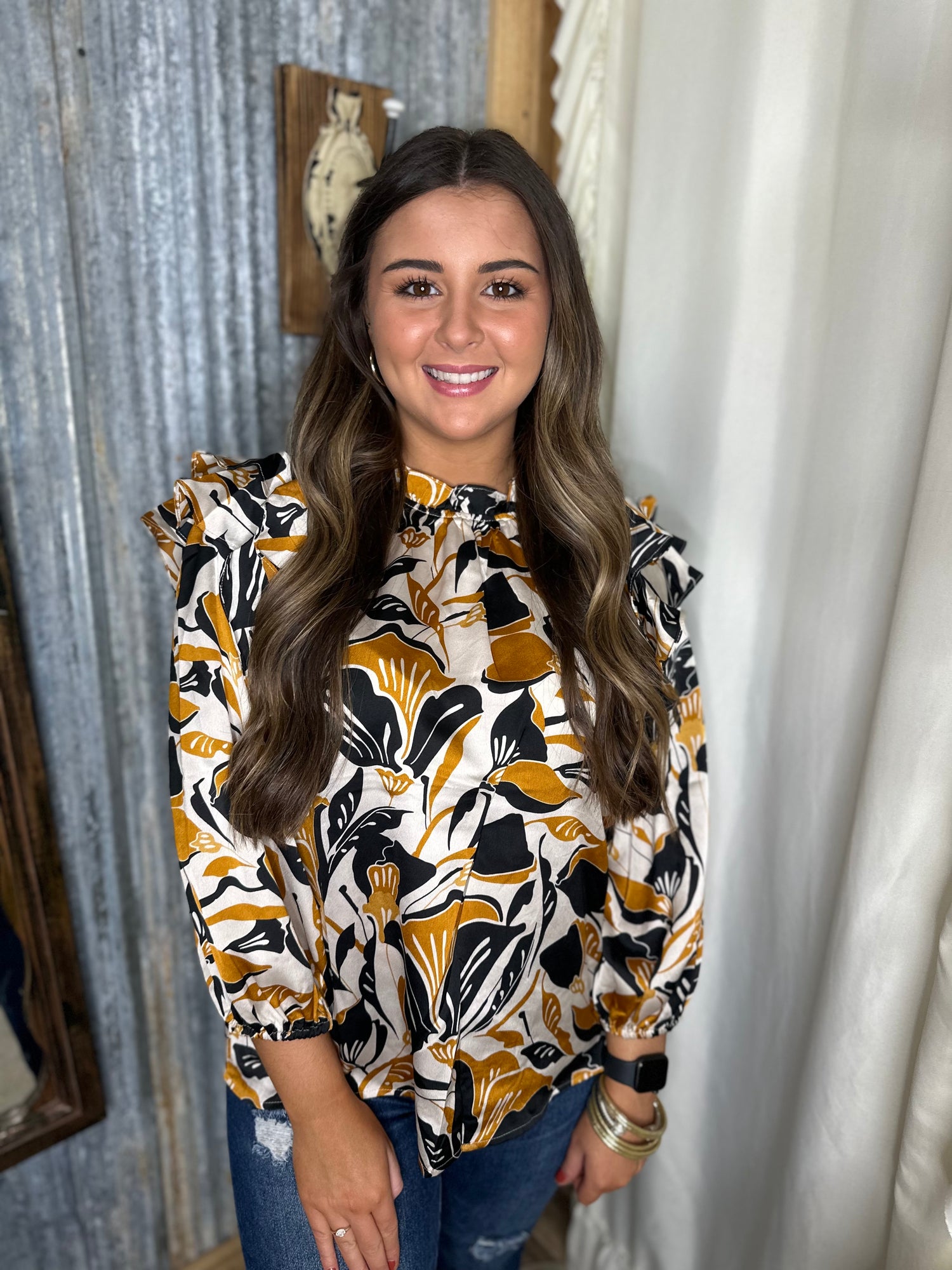 Satin floral print 3/4 sleeve mock neck top featuring ruffled detail at sleeves and neckline. Elasticized cuffs. Button closure at back. Unlined. Woven. Non-sheer. Lightweight.