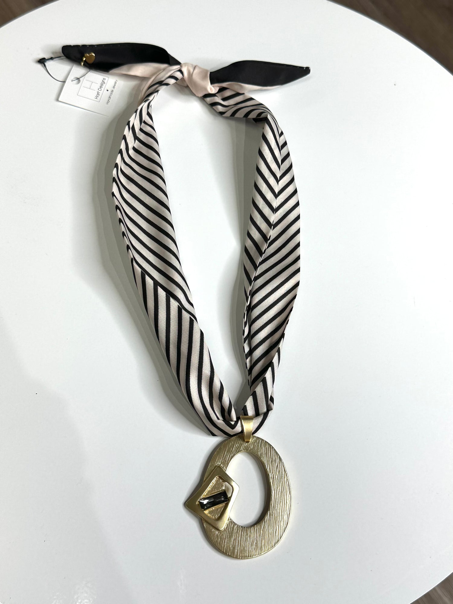 Hart Designs Scarf Necklace- Black & Cream Stripe with Gold Pendant