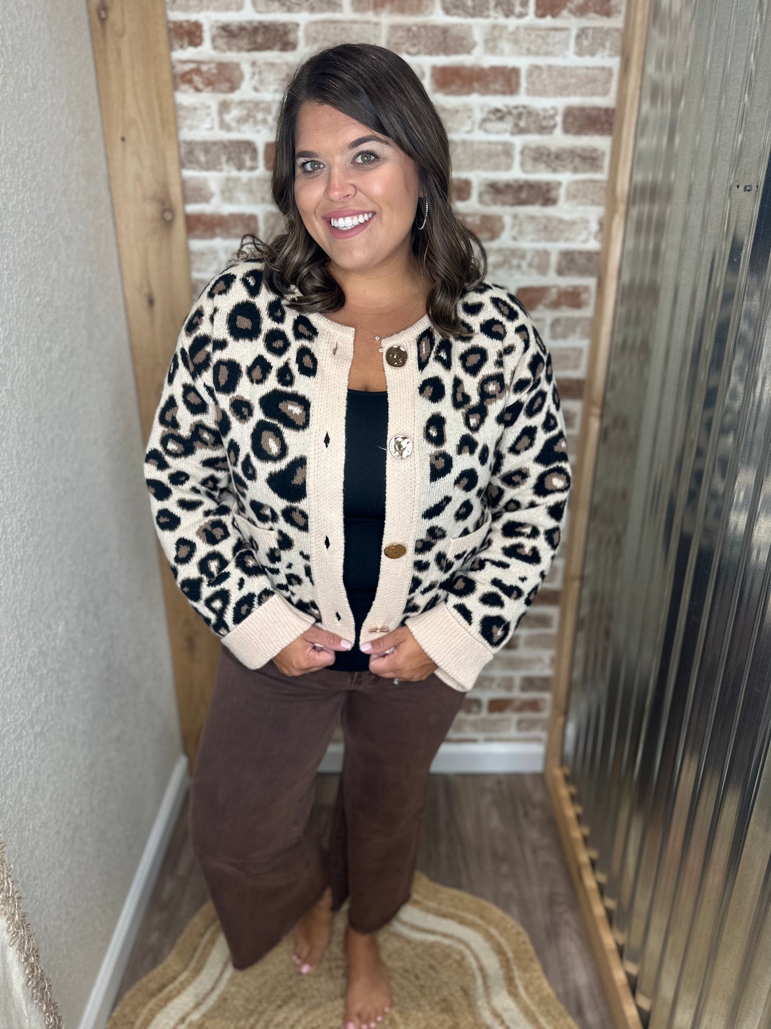Animal pattern long sleeve sweater knit cardigan featuring gold accent oversized button front closure. Unlined. Knit. Non-sheer. Lightweight.