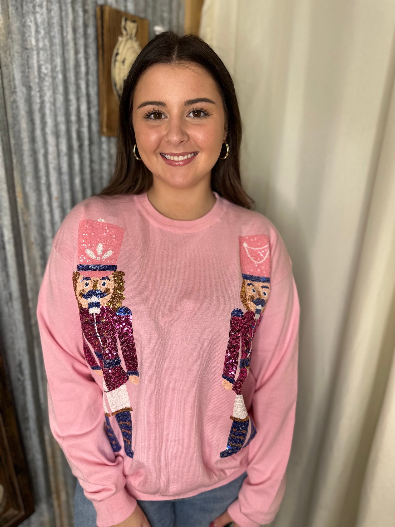 Baby pink loose fit sweater with nutcracker sequin embroidery.
