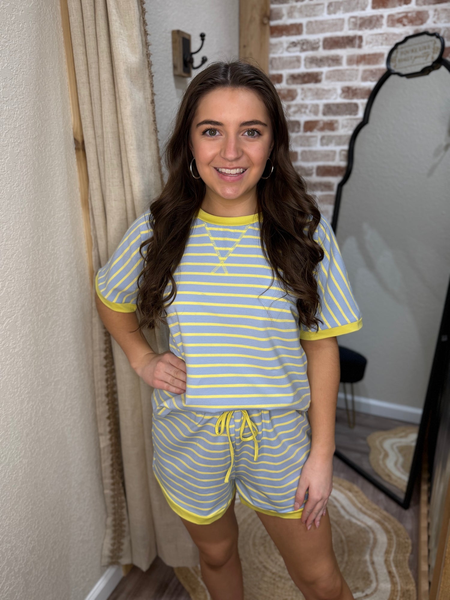 Short sleeves V-notched round neck stripe top & drawstring waist shorts sets, solid contrast binding detail, side pockets.