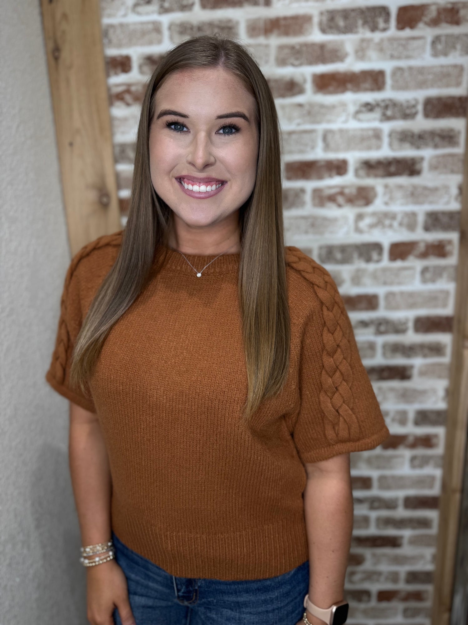 Solid short raglan sleeve sweater top featuring braided sleeve detail and ribbed hem, cuff, and neckline. Unlined. Knit. Non-sheer. Lightweight.