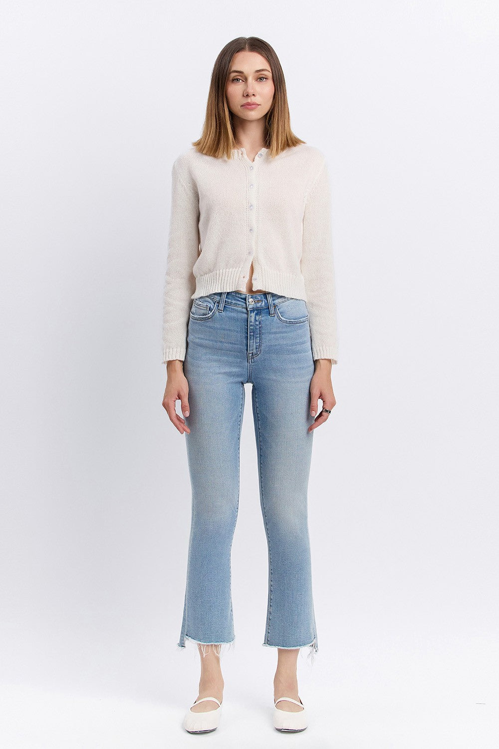 HIGH RISE RAW STEP HEM CROP FLARE JEANS COMFORT STRETCH DENIM, HIGH RISE WAIST, RAW STEP HEM, CROPPED LENGTH, FLARE JEANS F. RISE: 10" / INSEAM: 27" / LEG OPENING: 16"