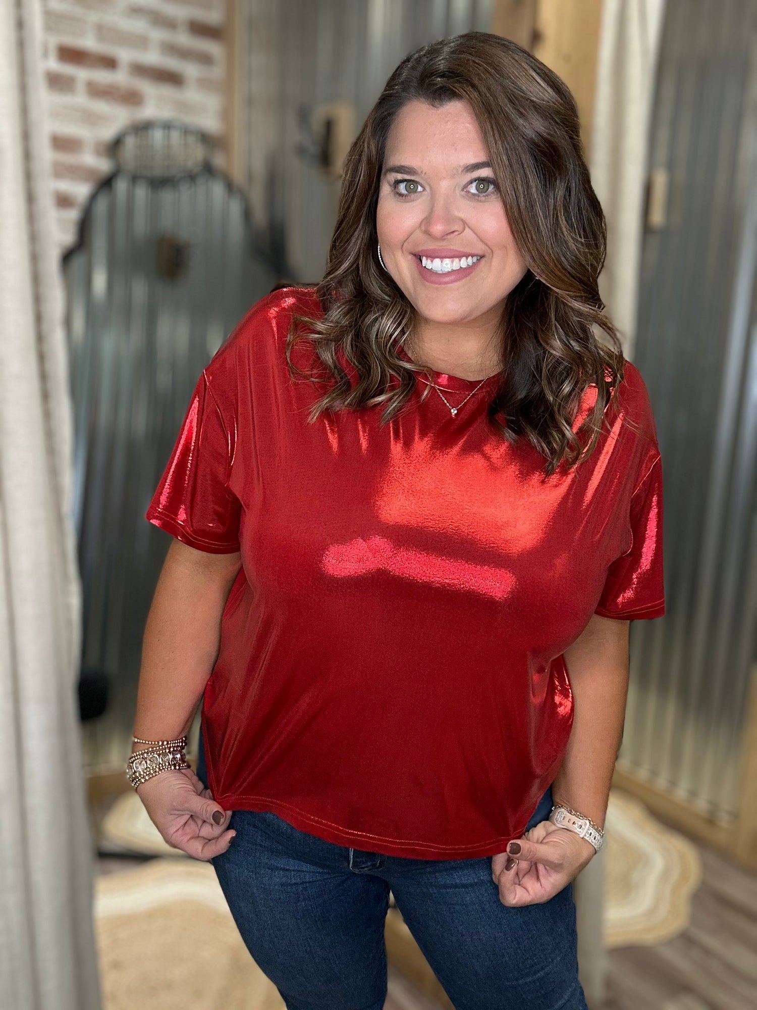 Relaxed boxy fit metallic foiled shimmer t-shirt top available in game day colors. Garnet, crimson, maroon. Lightweight, stretchy fabric.