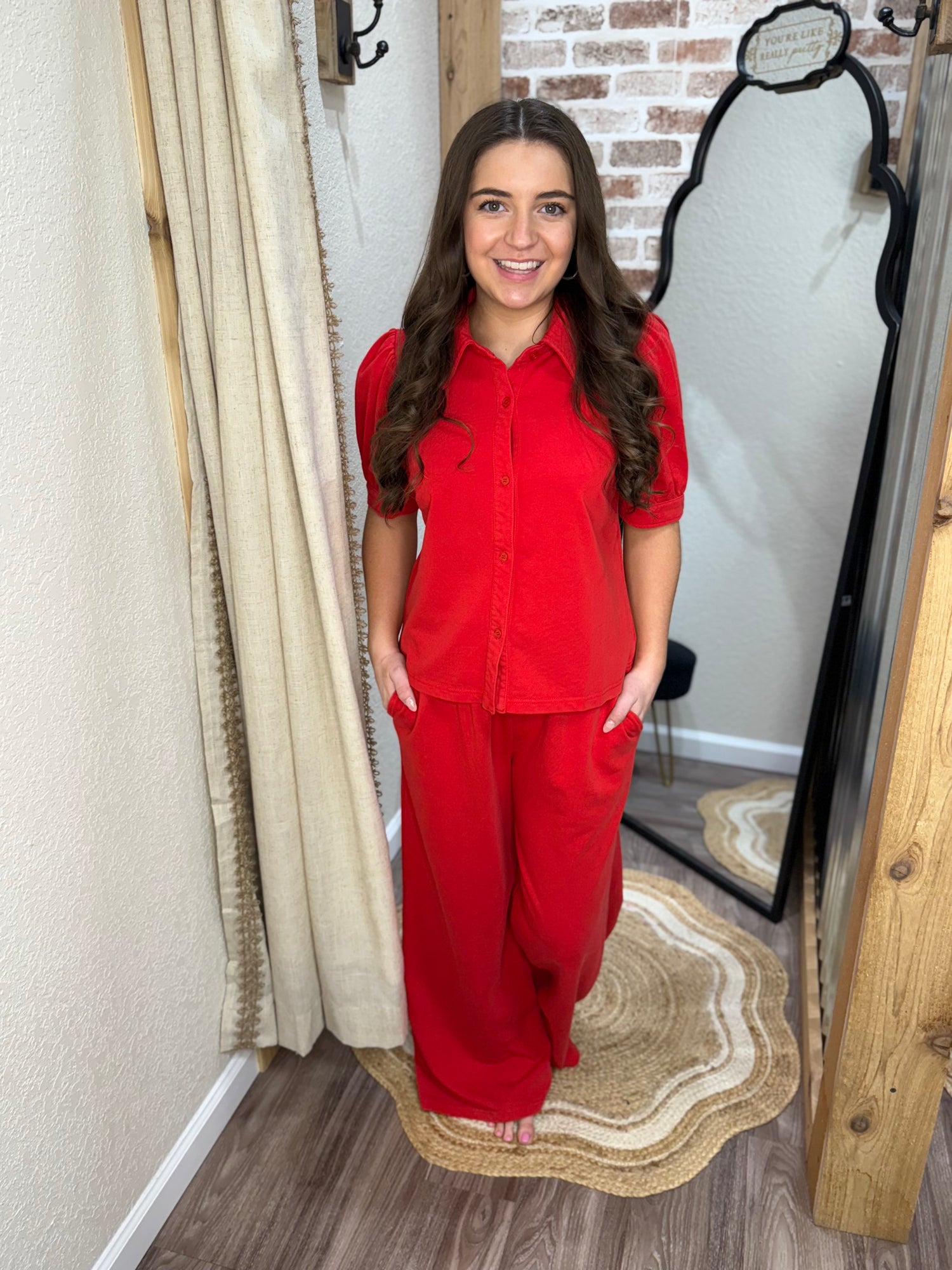 Bottoms: Drawstring waist wide leg washed pants with side pockets.