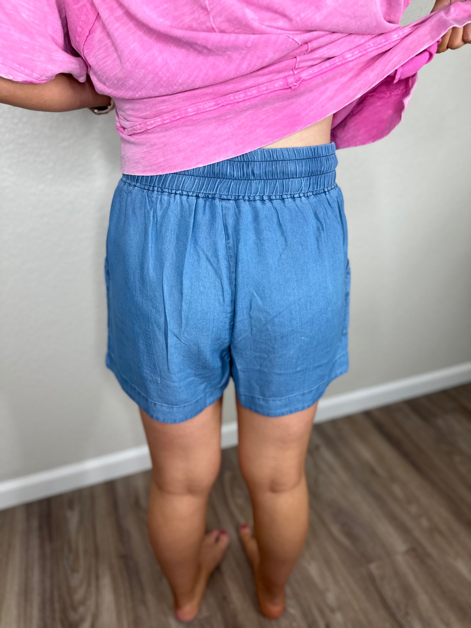 Washed denim shorts with drawstring waistline, side pockets, and stitch seams edge.