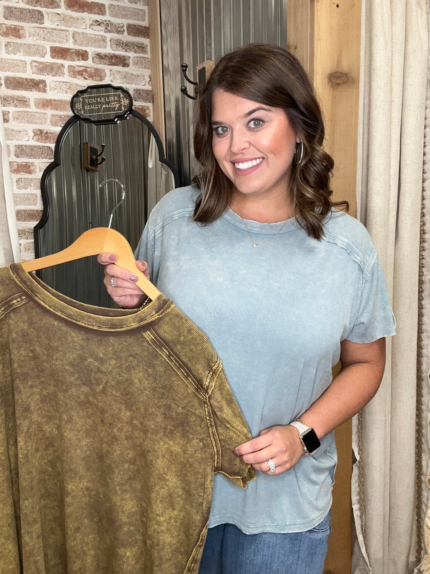 WASHED RIBBED SHORT SLEEVE BOAT-NECK TOP